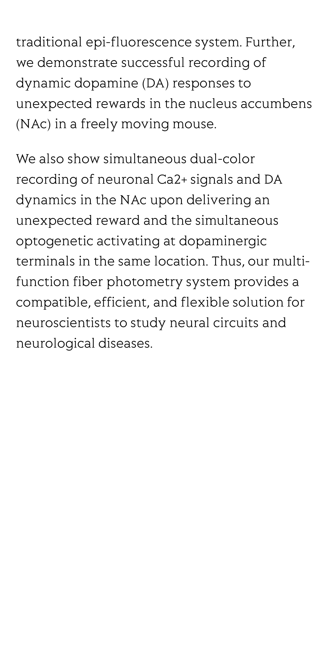 We also show simultaneous dual-color recording of neuronal Ca2+ signals and DA dynamics in the NAc upon delivering an unexpected reward and the simultaneous optogenetic activating at dopaminergic terminals in the same location. Thus, our multi-function fiber photometry system provides a compatible, efficient, and flexible solution for neuroscientists to study neural circuits and neurological diseases.
