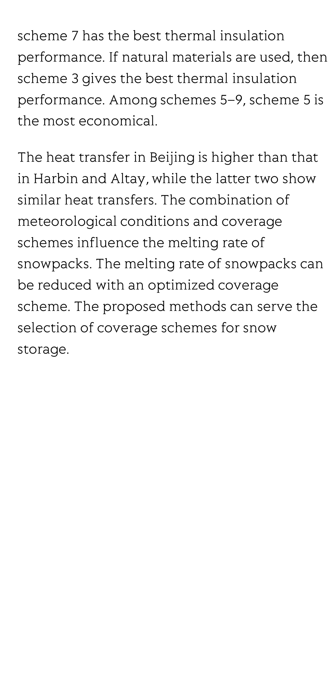 The heat transfer in Beijing is higher than that in Harbin and Altay, while the latter two show similar heat transfers. The combination of meteorological conditions and coverage schemes influence the melting rate of snowpacks. The melting rate of snowpacks can be reduced with an optimized coverage scheme. The proposed methods can serve the selection of coverage schemes for snow storage.