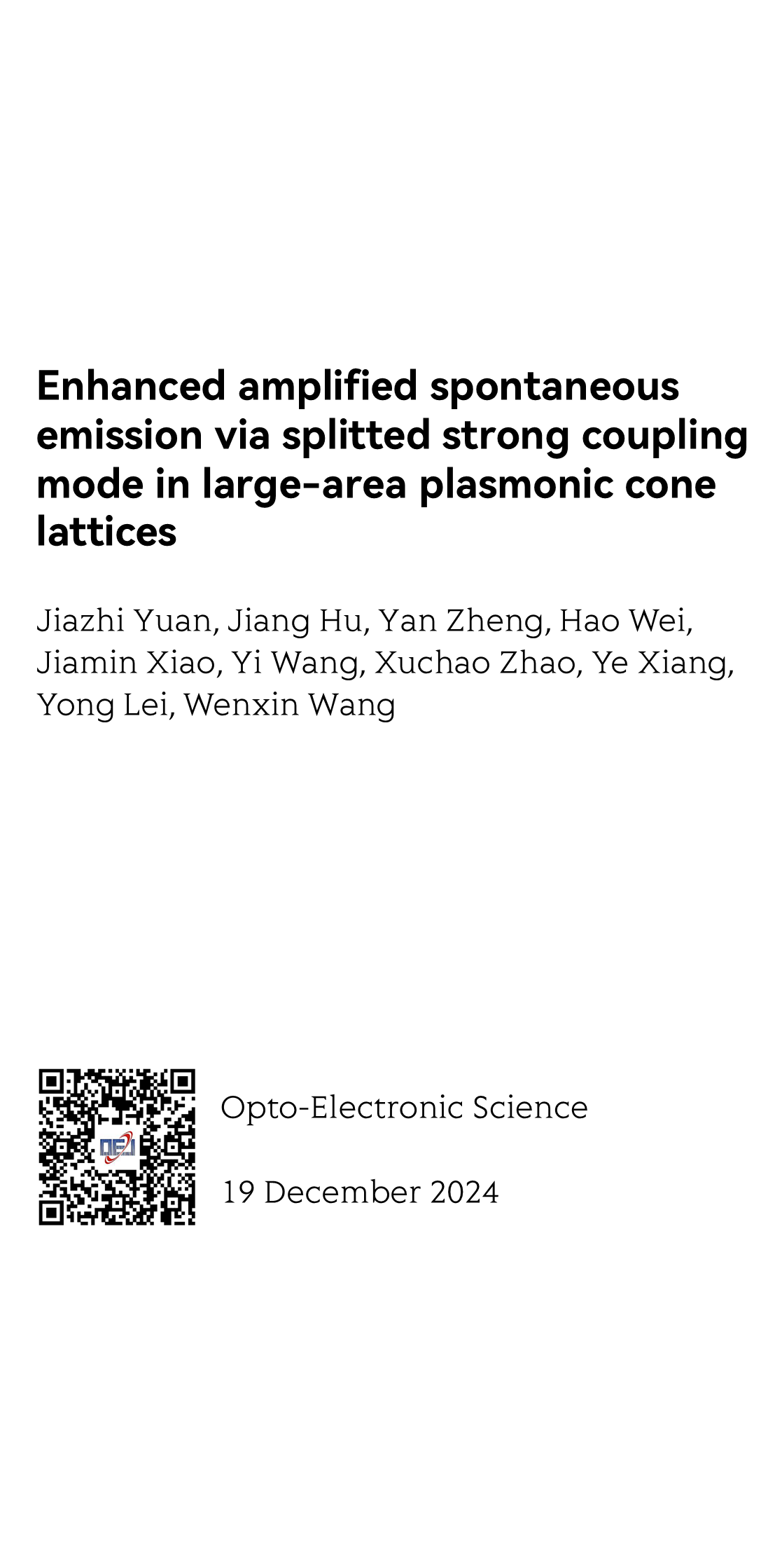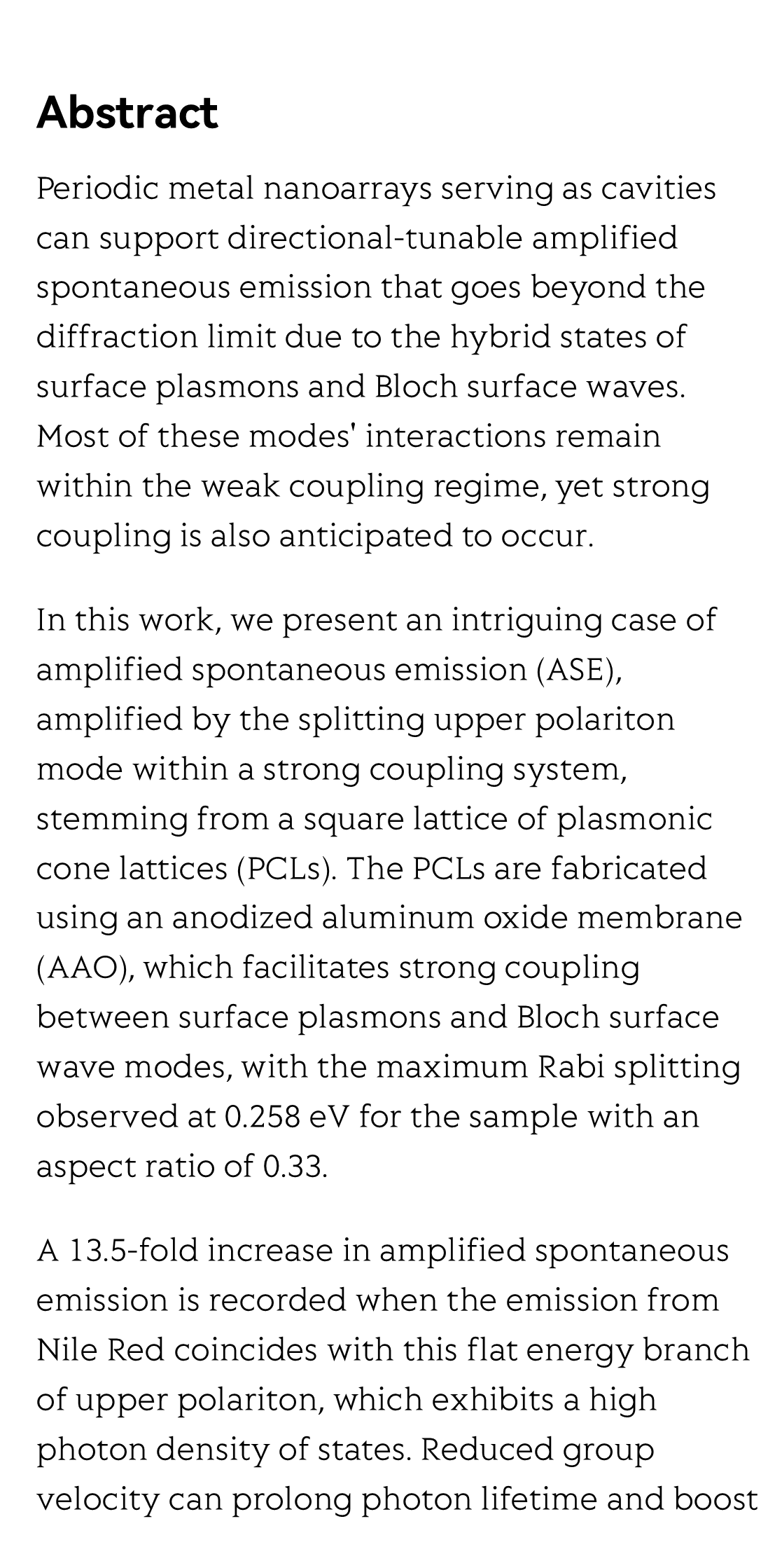 (Peer-Reviewed) Enhanced amplified spontaneous emission via splitted strong coupling mode in large-area plasmonic cone lattices