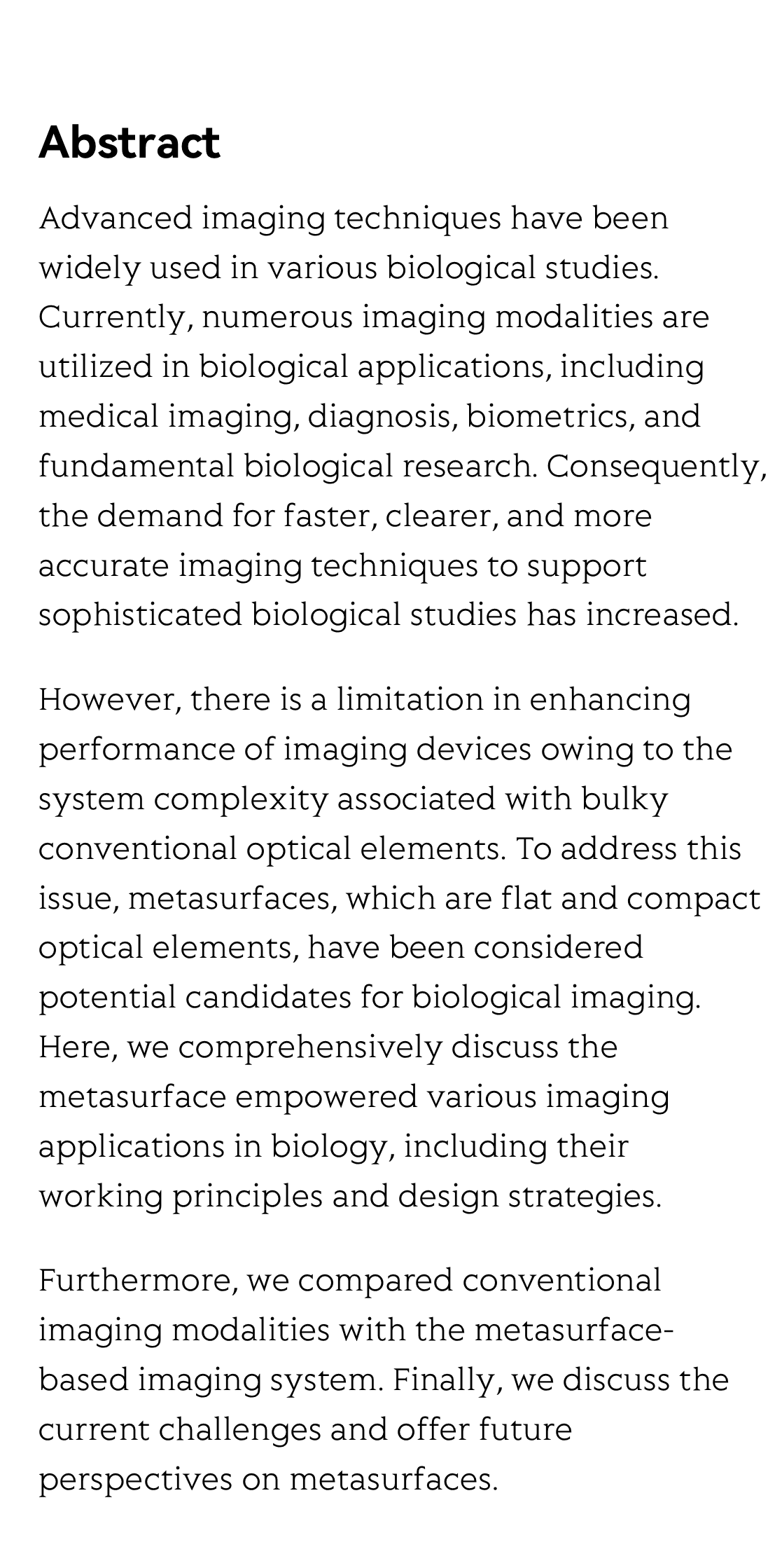 Furthermore, we compared conventional imaging modalities with the metasurface-based imaging system. Finally, we discuss the current challenges and offer future perspectives on metasurfaces.